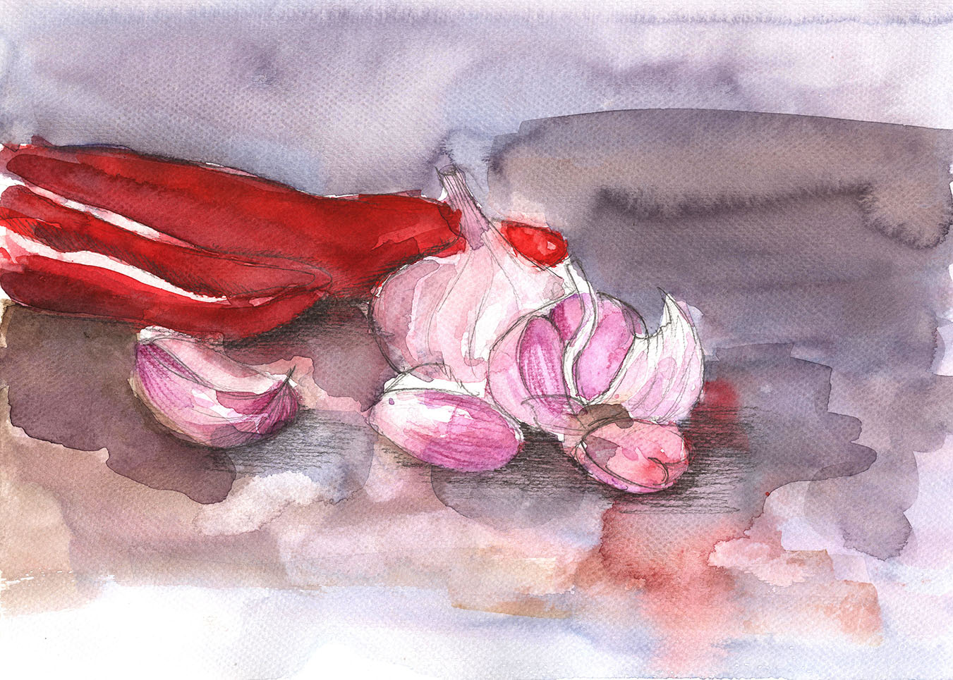 papryka czosnek czerwień czerwony fiolet fioletowy martwa natura akwarele