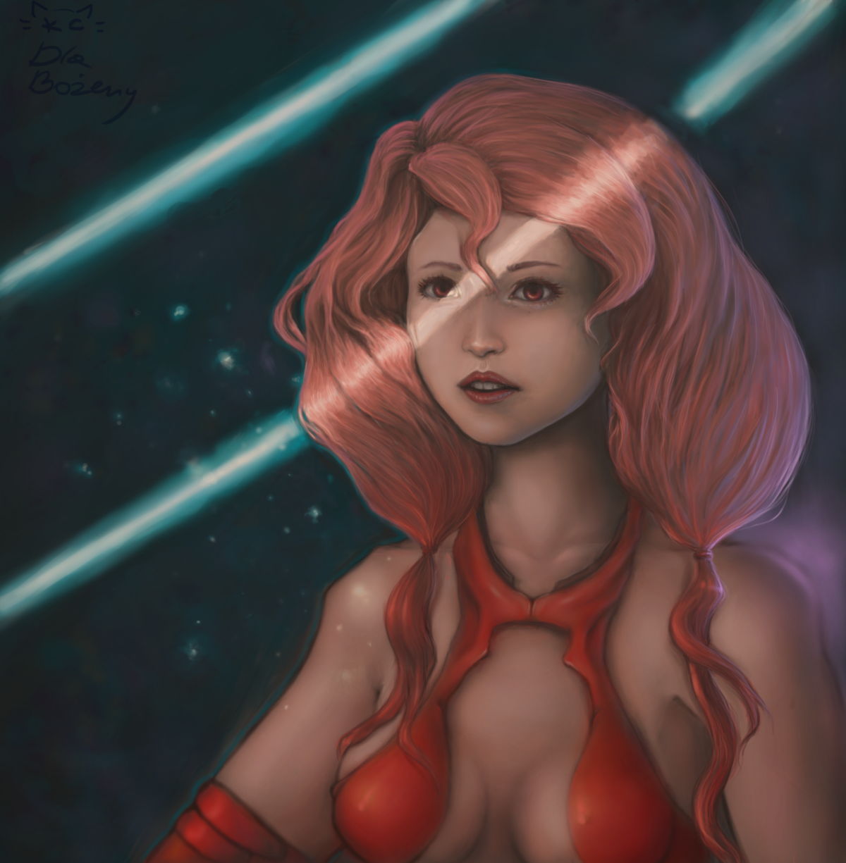 Na DP się zbytnio nie znam, ale wydaje się spoko, chociaż faktycznie miejscami może jest trochę płasko. Szczególnie twarz i włosy po lewej. Oczom przydałoby się dodać jakiegoś blasku czy coś, bo też tak trochę płaskie i bez życia są. Włosy również troszkę martwe (jakby z waty), tylko fragment, gdzie pada światło i przy gumce na kucyku po prawej mi się bardzo podoba. Mięsień na ramieniu po lewej chyba odrobinę zbyt kanciasty. I wydaje mi się, że ten strój nie powinien mieć takich ciemnych, wyraźnych konturów, ale może to taki styl (jak już pisałam, nie znam się zbytnio  ). Nie jestem też pewna, czy promień światła powinien tak się wyginać, tzn. rozumiem, że się zniekształca na twarzy, ale dalej w tle powinien chyba być pod tym samym kątem, co wyżej. Mimo to ogólnie ładna praca.