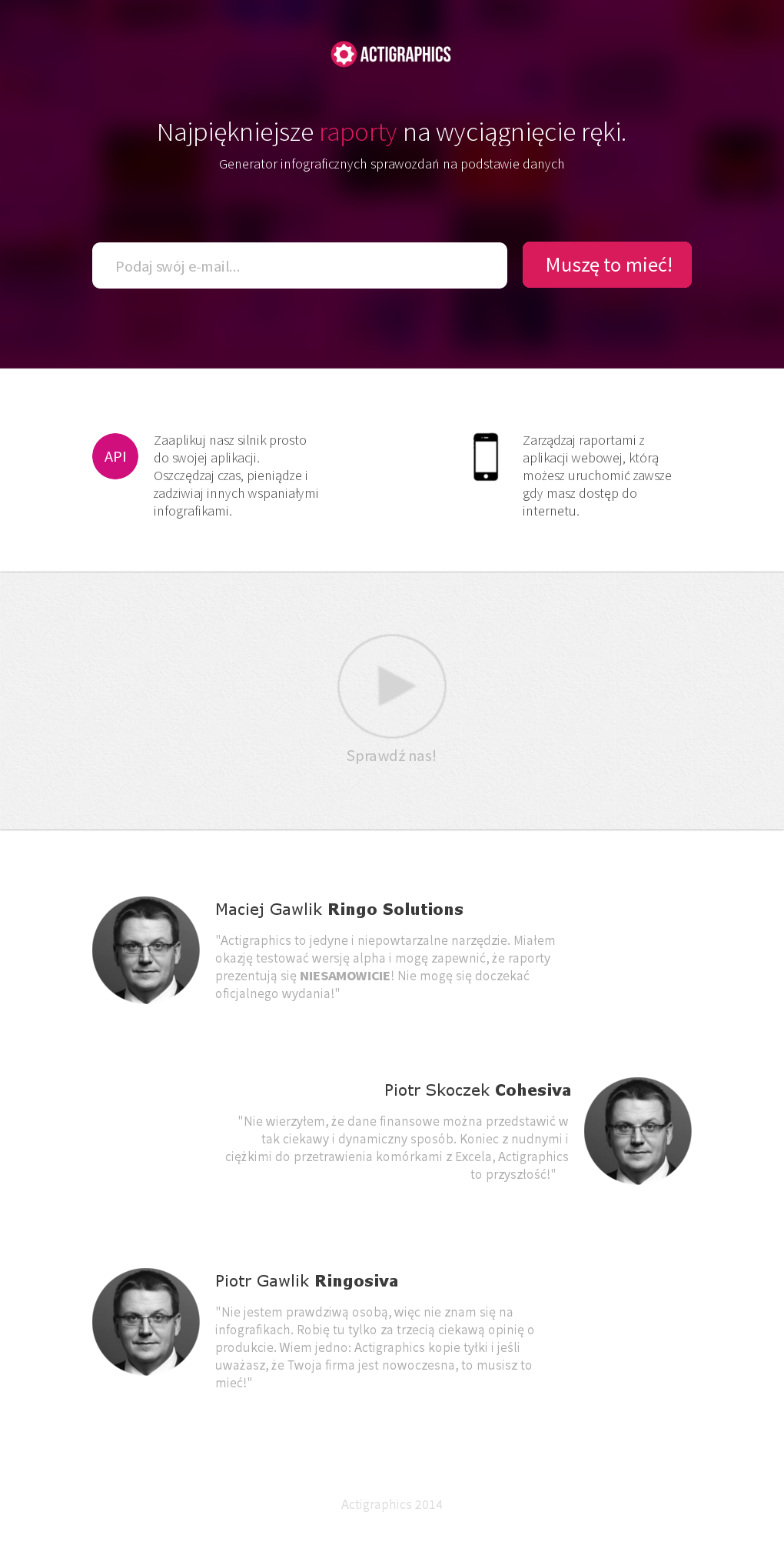 Squeeze page dla aplikacji, która dopiero powstaje, strona miała na celu skoncentrować uwagę odwiedzającego na podaniu adresu, ew na filmiku wprowadzającym, dopełniając to wrażeniami z wersji testowej.