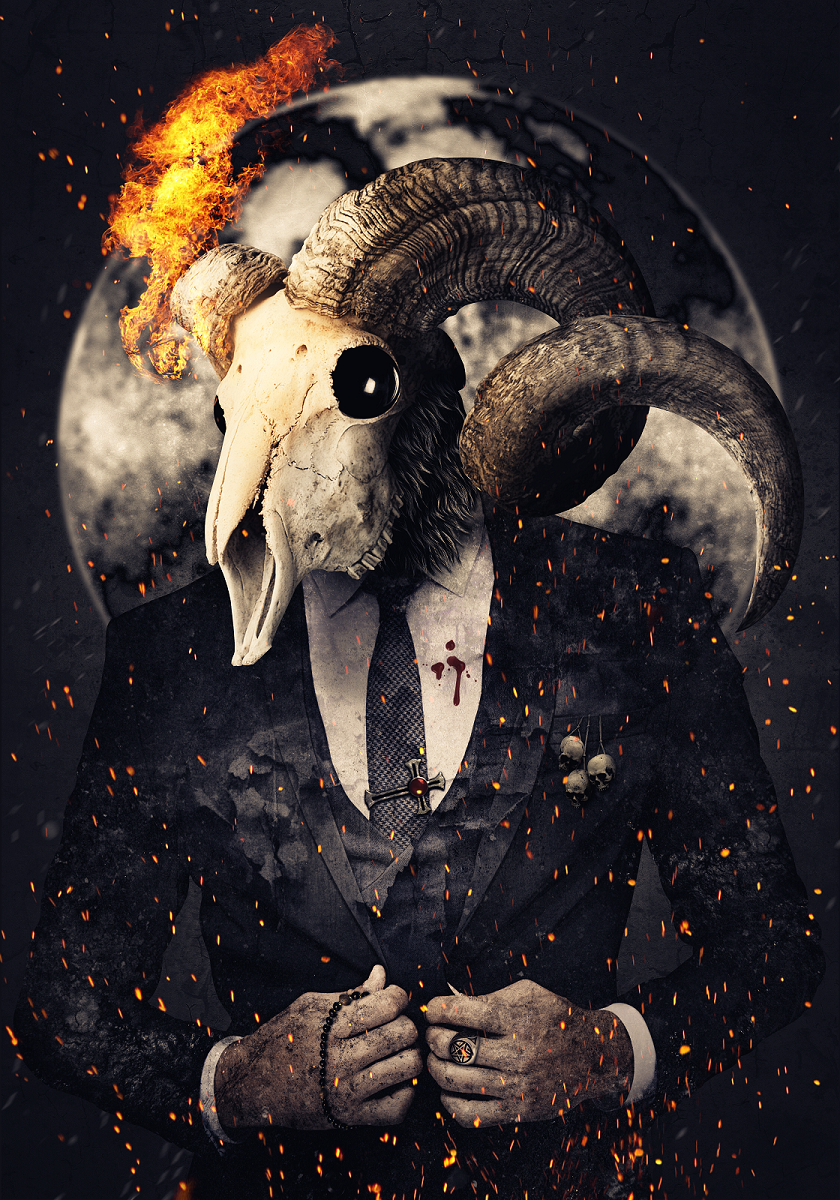 Jedyne do czego mogę się przyczepić to ten ognik (jakiś taki zupełnie przypadkowy i w sumie niepotrzebny się wydaje) i prawy róg tego diobła - nie wydaje mi się, żeby czaszka pana w garniaku w rzeczywistości zasłoniła go (tego "roga") w calości - no chyba, że jest wykrzywiony do tyłu, ale to chyba dość nietypowy układ. A ja myślałam, że ten róg jest odcięty i to właśnie z niego ten ogień się wydobywa.